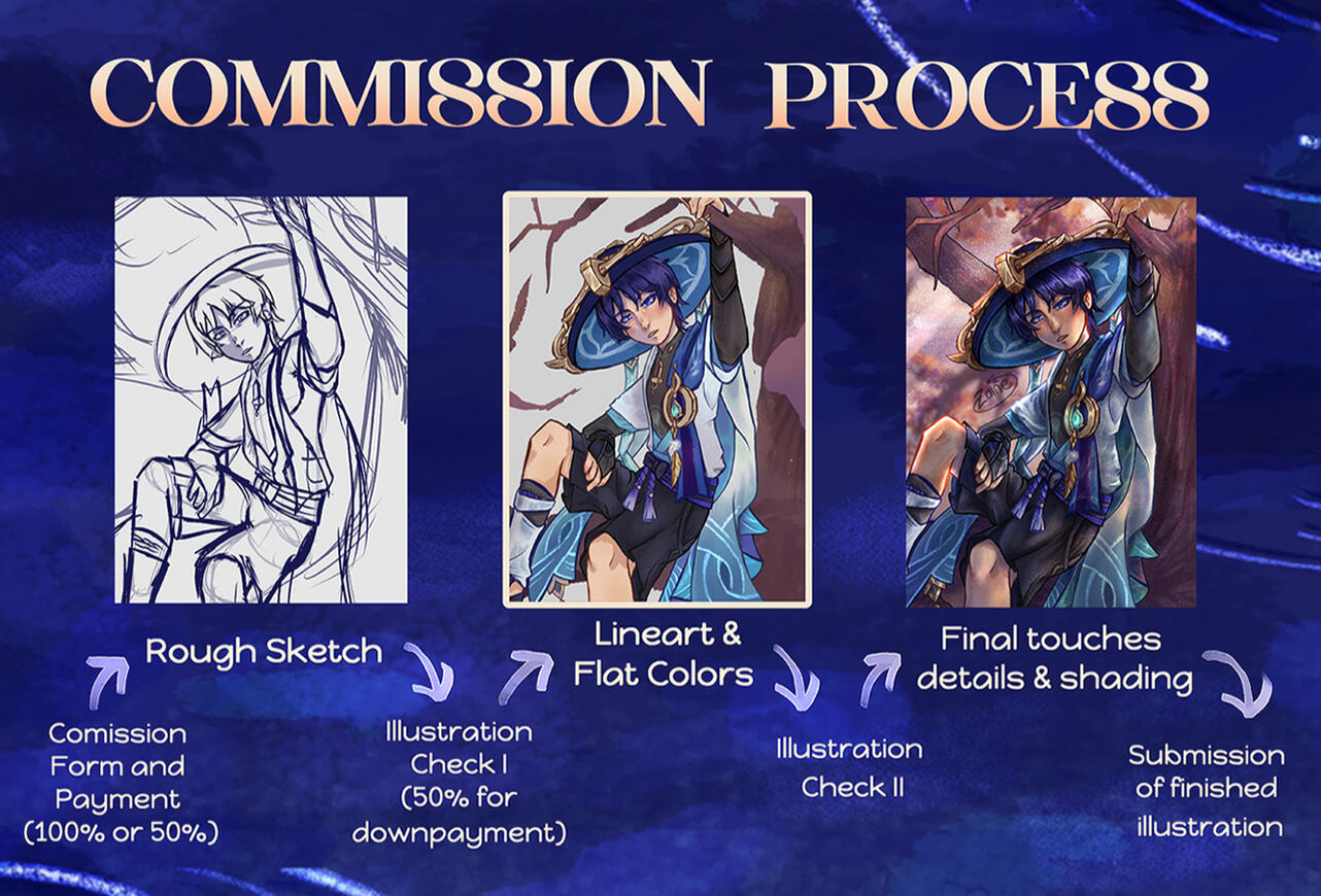 1.) Before placing an order please make sure to carefully read and review the Terms of Service (TOS) and review the price list. Use the provided order form and complete all required fields. Incomplete or incorrect information will result in your order being disregarded.Once your request has been confirmed, we can proceed to discuss further commission details.2.) Be specific and provide visual references. (Poses, outfits, color palette, The more references you provide, the better the result.3.) Payment is required before I begin your commission. You may choose to pay 100% upfront or pay 50% upfront and the remaining 50% after your approval of the illustration sketch.4.) During the commission process, you will receive updates at key stages: the rough sketch and the lineart & flat coloring. At these work-in-progress (WIP) stages, you may request up to three major revisions. Once the final detailed rendering begins, no further major changes can be made.Any additional changes beyond that will incur an extra free5.) Once the artwork is completed, the final high-resolution file will be emailed to the client’s provided Gmail account.∘₊✧──────✧₊∘If you have any questions, feel free to send me a DM through any of my active accounts (Instagram, Tumblr, Discord) or send me an email at [email protected]